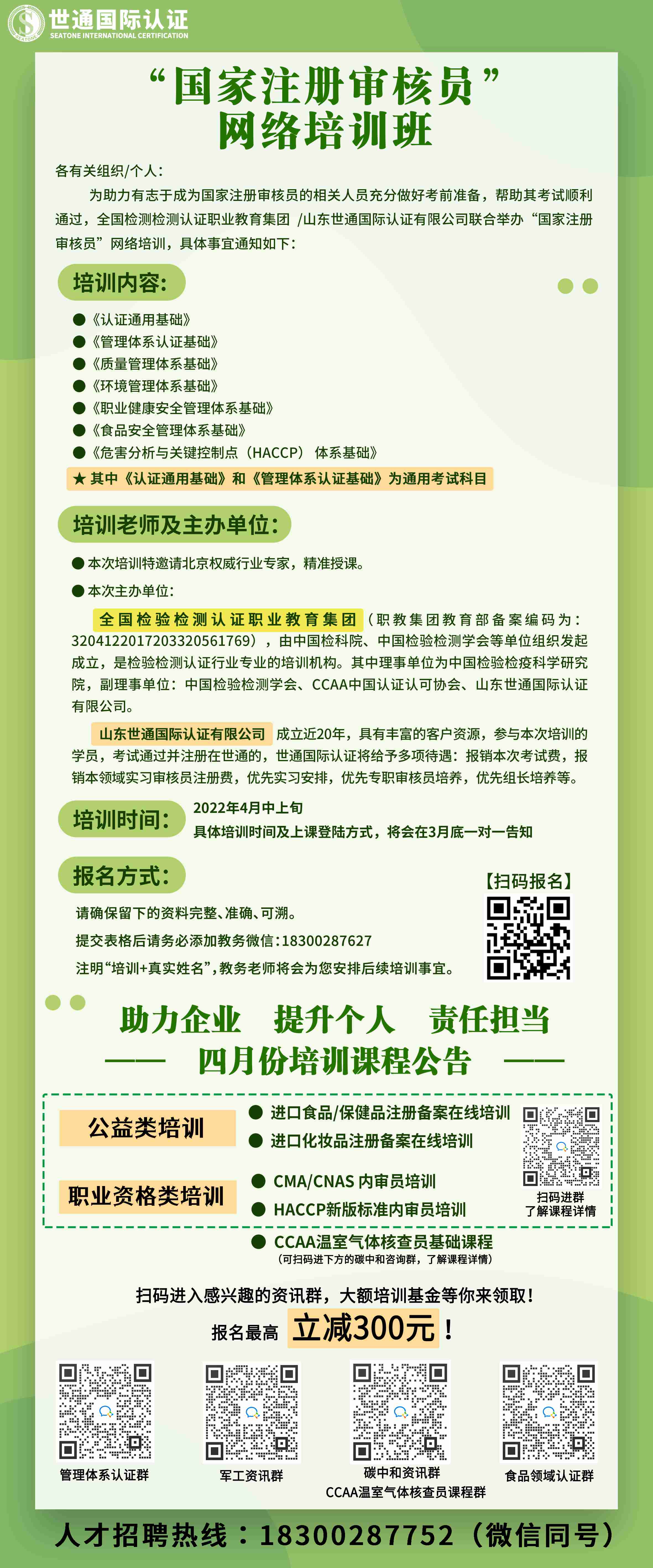 为助力有志于成为国家注册审核员的相关人员充分做好考前准备,帮助其顺利通过考试,全国检测检测认证职业教育集团和山东世通国际认证有限公司联合举办“国家注册审核员”网络培训,具体事宜通知如下: